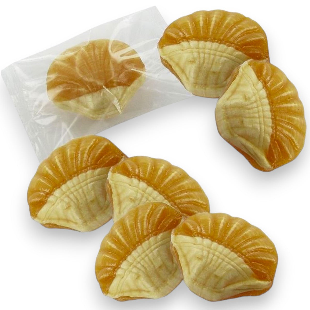 Confiserie en sucre cuit en forme de coquillage, au coeur tendre fourré au caramel beurre salé.