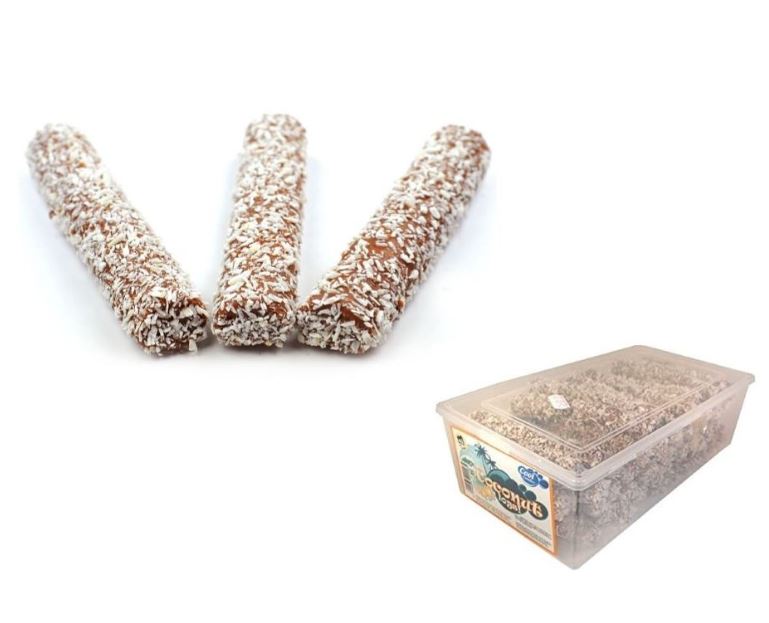Délicieux bâtonnets fourrés à la guimauve et enrobés d'une couche de chocolat et d'éclats de noix de coco.