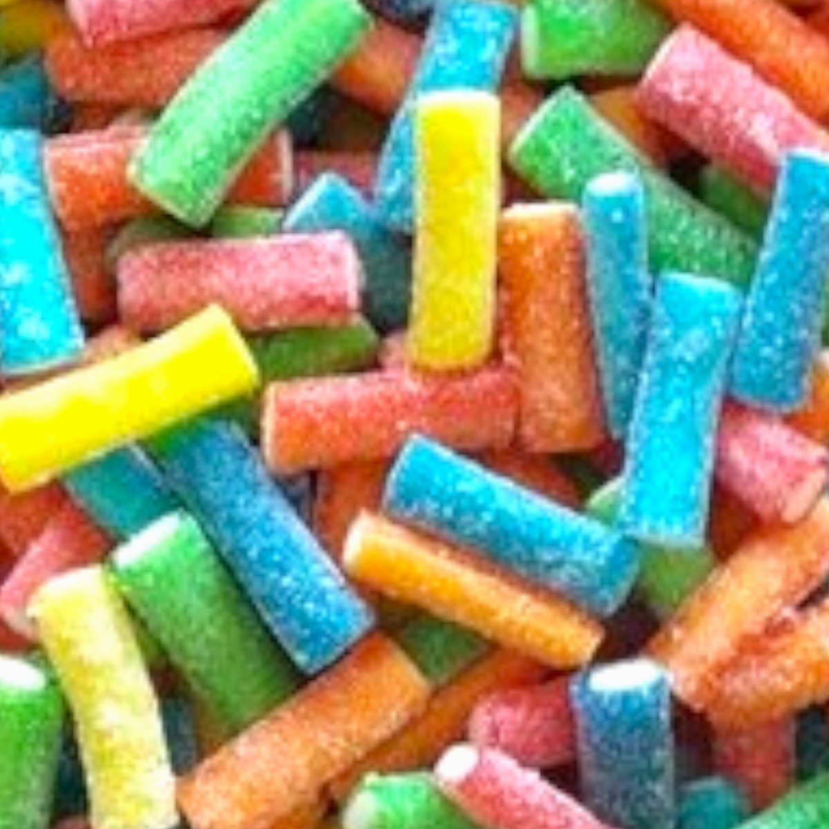 Sucre, Sirop de glucose-fructose, farine de blé, amidon, acidifiants : E330, E296, huile et graisse végétale (palme), amidon modifié de pomme de terre, eau, humectants : E420(ii), E422, gélatine de bœuf, arômes, correcteur d'acidité E331(iii), émulsifiant E471, colorants : E100, E129, E133. Allergène : Contient du Gluten .